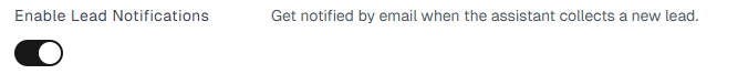 To use this feature, enable the Enable Lead Notifications toggle. Once enabled, an email notification will be sent whenever a visitor submits their contact details through the assistant.