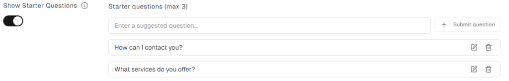 Enable Show Starter Questions to display clickable prompts in the chat window.