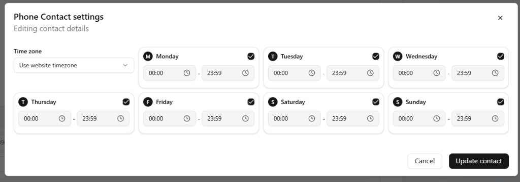 - Choose the days of the week and specific times the contact will be available to users.