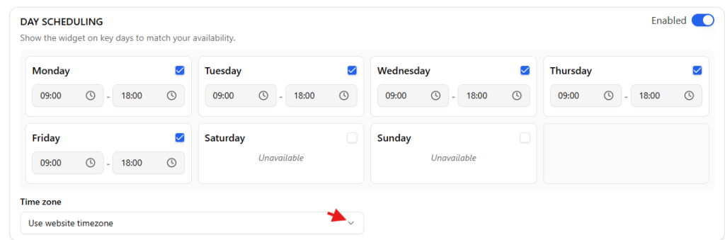 Day scheduling allows you to control which days and hours your widget appears on your website. This helps you align the widget’s visibility with your availability or business hours.