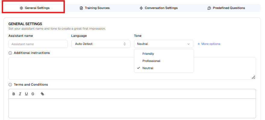 The General Settings tab defines the assistant’s identity, tone, and foundational instructions.