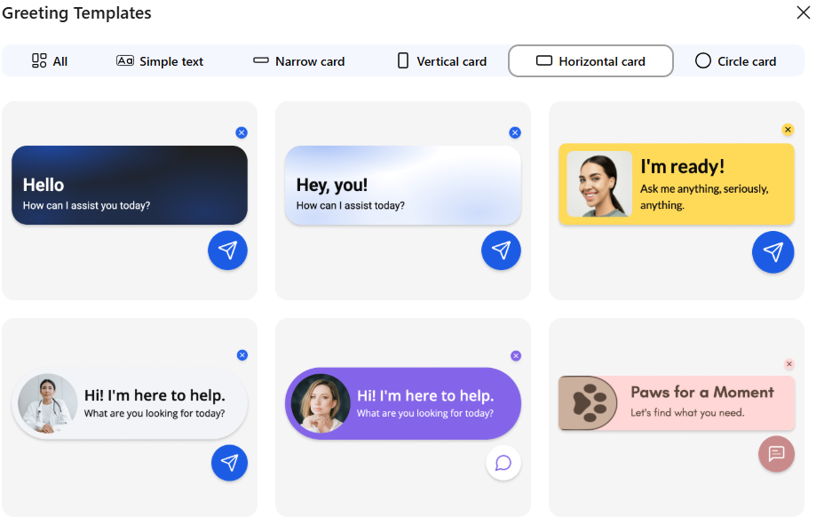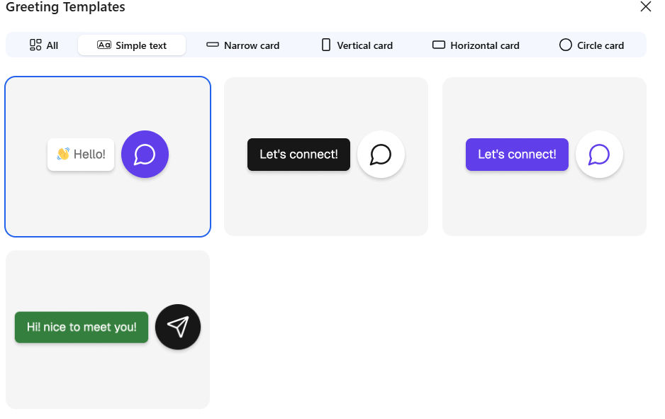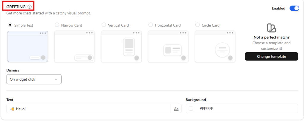 The Greeting feature allows you to display a short message next to the widget to encourage visitors to start a conversation. This visual prompt helps increase engagement by drawing attention to the widget.