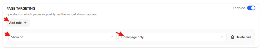 Page targeting allows you to control where your widget appears across your website. With this feature, you can choose specific pages, posts, or content types where the widget should be displayed or hidden, giving you more flexibility and precision.
